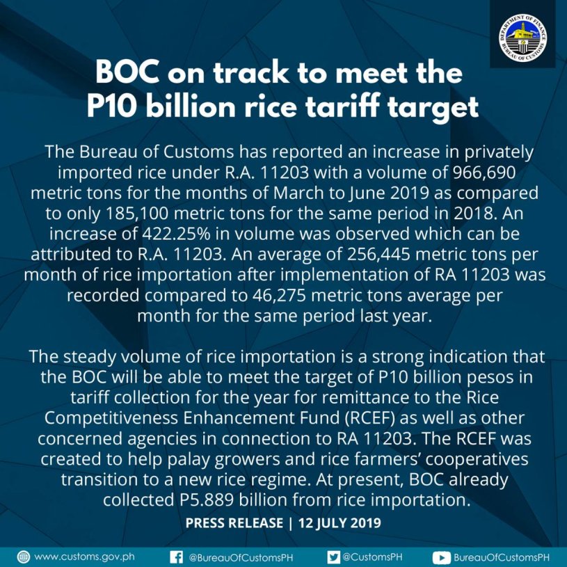 MANILA, July 13 — In line with the commitment of the Bureau of Customs (BOC) to the implementation of Republic Act (RA) No. 11203 also known as the Rice Import Tariffication Law, Commissioner Rey Leonardo B. Guerrero reported that the Bureau is on track to meet the P10 billion target tariff collection set under the law.